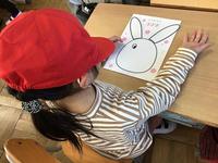 まわりの子が言う「UP!、DOWN!、LEFT!、RIGHT!」の声で、顔のパーツを台紙に並べました。