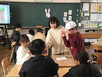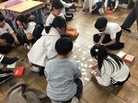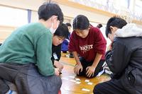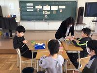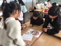 1・4年生の英語授業では、英語をつかって「福笑い」をチームで行いました。