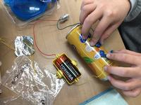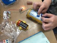 学習課題に取り組んでいました。子どもたちが自宅から持ってきた缶の一部分を削って研き、電極を当て、