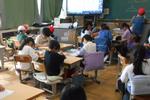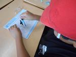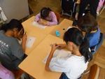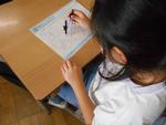 算数で使う道具の中にコンパスがあります。コンパスの算数での使い方には、図形の学習で円や半円、弧の形をかくことがありますが、他に同じ長さを写し取る、ある点から同じ距離にある点の集まり(円、弧)をかく、などの使い方があります。3年生では、スムーズに作図に使うことができるように、コンパスの使い方に慣れる練習もします。円を組み合わせてできている図形をまねてかく練習をしながら、うまくかけて満足げな表情を見せてくれた3年生でした。