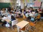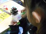 先週、1年生が戸崎公園へ「秋見つけ」に行きました。公園では、たくさんのマツボックリやドングリを見つけてきました。そのマツボックリを使って、教室ではクリスマスツリー作りをしていました。空きカップの上にマツボックリを取り付け、カラフルなモールやピカピカの小さなふわふわボールなどをボンドで付けて飾っていました。どんぐりには、専用の機械で穴を空け、つま楊枝を差してドングリごまにしていました。「見て見て、きれいでしょ」と周りに話しかけながら、夢中になって作っていた1年生でした。