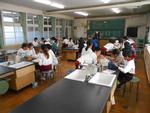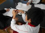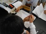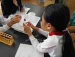 理科室で4年生が2つのビーカーにそれぞれ温度計を差した試験管を入れて、横から見ています。試験管には赤線がつけてあり、線まで水を入れたようです。2つのビーカーに指を入れさせてもらうと、一つは結構熱いお湯、もう一つは冷たい氷水でした。黒板には「物の体積と温度」と書いてあります。空気は温めると体積が大きくなり、冷やすと小さくなることを学習したあとに、水はどうだろうかと予想して実験していました。自分の予想通りになるかどうか、じっと試験管を見つめている4年生たちでした。
