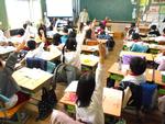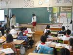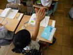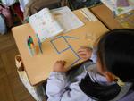 1年生が机の上で数え棒を並べて「8」を作っています。算数の「かたちづくり」で、棒を1本とって「9」にしたり2本とって「2」をつくったりしようと考えていました。頭の中で考えてすぐに気が付く子、いろいろな場所の棒を取って試しながら見つける子など、それぞれのやり方で見つけていました。三角形の色板や線結びなど、形について学習を進めてきた1年生でした。