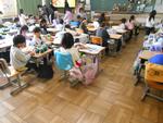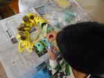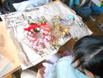 1年生が自分で育てたアサガオのツルを使って作ったリースに、飾りつけをしていました。思い思いの材料をくるくると巻き付けたり、花やリボン、モールなどをボンドで貼り付けたりしています。「先生、見て見て」とたくさんの子が自分の作品をうれしそうに見せてくれました。出来上がりを楽しみに笑顔でリース作りを進めていた1年生でした。