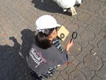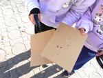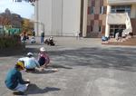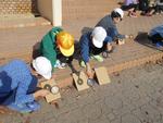 3年生が虫めがねで日光を集める実験をしていました。ダンボールの板に虫めがねで日光を上手く集められるように虫めがねの傾きや間隔を、集められた眩しい光を見ながら調整しています。うまくいくと、すぐに煙が出てきて、焦げ臭いにおいが漂ってきます。「煙が出たら、すぐに止めるように」と先生から注意を受けながら、何個も焦げた跡をつけていました。「先生、顔みたいになった」と焦げた跡が付いたダンボールをうれしそうに見せてくれた3年生でした。