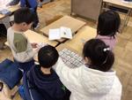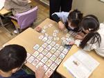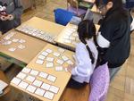 教室の机の上にカルタを並べています。2年生が「むかしから つたわる 言い方」の国語の授業で、「いろは歌」から「いろはにほへと ちりぬるを…」を習っています。言葉はよく知られていますが、いろは歌としてメロディーが付いたものは知りませんでした。昔は、この歌でひらがなの文字を覚えていたようです。歌で出てくる順番にカルタをチームで一緒に並べ、「字の形がちがうひらがながあるね」と言いながら、昔の覚え方に親しんでいた2年生でした。