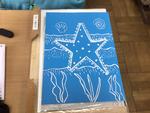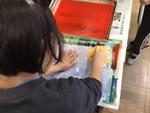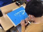 4年生が教室で木版画の制作をしていました。魚やヒトデなど、思い思いに描きたいものを板に写し取り、彫刻刀で彫り進めていました。線の太さを調節したり、細かい模様を彫り込んだりして、自分なりの海の世界を描いていました。板にインクを刷り込んで印刷紙を置き、色が出るように何度もバレンでこすっている子もいました。刷り上がりを楽しみに夢中になって彫っている4年生でした。