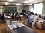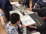 理科室で物のとけ方について、5年生が実験をしていました。ビーカーに入れた水の温度を20℃、40℃、60℃と変えながら、食塩とミョウバンが何グラムとけるか試しています。14gから始め、温度計を見ながら食塩やミョウバンを入れてかき混ぜ、見えなくなればとけたことになり、また2g追加していきます。実験結果をみんなの理科ノートに書き込みながら、予想した結果になるかどうか、じっとビーカーを見つめていた5年生でした。