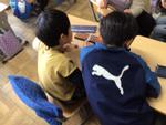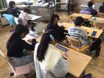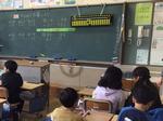 黒板に大きなそろばんが吊り下げられています。3年生の算数で、そろばんの仕組みや使い方を学習しています。数字の表し方やたし算、ひき算の計算方法などをみんなで確かめながら進めていました。となり同士で指の使い方や答えを聞き合いながら、昔から使われてきたそろばんのよさを感じていた3年生でした。