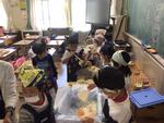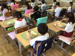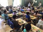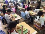 1年生が初めての給食の日でした。エプロンをつけてマスクをして、今日のメニューはなにかワクワクしながら準備をしていました。まずは給食当番にご飯やおかずなどのよそい方を伝えます。しゃもじの持ち方やよそう量など、先生に聞きながら、上手によそっていました。同じ量だけ配膳された器から、自分に合う量に調節してもらい、みんなで楽しく給食を食べていた1年生でした。