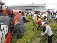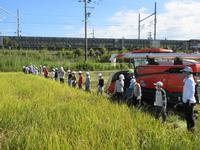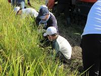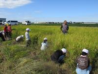 4つのグループに分かれて順番に、かまを使って稲を刈っていきました。