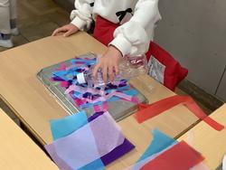 おはながみをちぎったり、重ねたり、せんたくのりでくっつけたりして、オリジナルのかざりを作ることができました。
