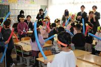 本日の3時間目に、1年1組の音楽で「シンコペーテッドクロック」という曲を鑑賞しました。曲の中でウッドブロックが時計の針を表し、トライアングルが目覚まし時計のベルの音を表していることを知り、時計の被り物をかぶりながら頭を振るなど、楽しく体を動かしながら鑑賞をすることができました。