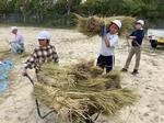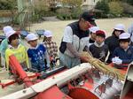 脱穀体験では、講師の方に教えていただきながら、刈り取った稲を脱穀していきました。子どもたちは、協力しててきぱきと動き、たくさんの量の稲を脱穀し終えて、笑顔いっぱい。脱穀体験でいろいろなことを学んだようでした。