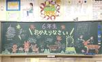 「もうすぐ6年生が帰ってくるから、メッセージをかきたい」という5年生の提案で『おかえり黒板』を仕上げました。6年生を喜ばせようと、黒板いっぱいに奈良のシカや大仏を描く姿は、とてもかわいらしかったです。