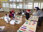 さまざまな色とさまざまな形を組み合わせた飾り付け用のカードが教室に並ぶと、子どもたちは大喜び。