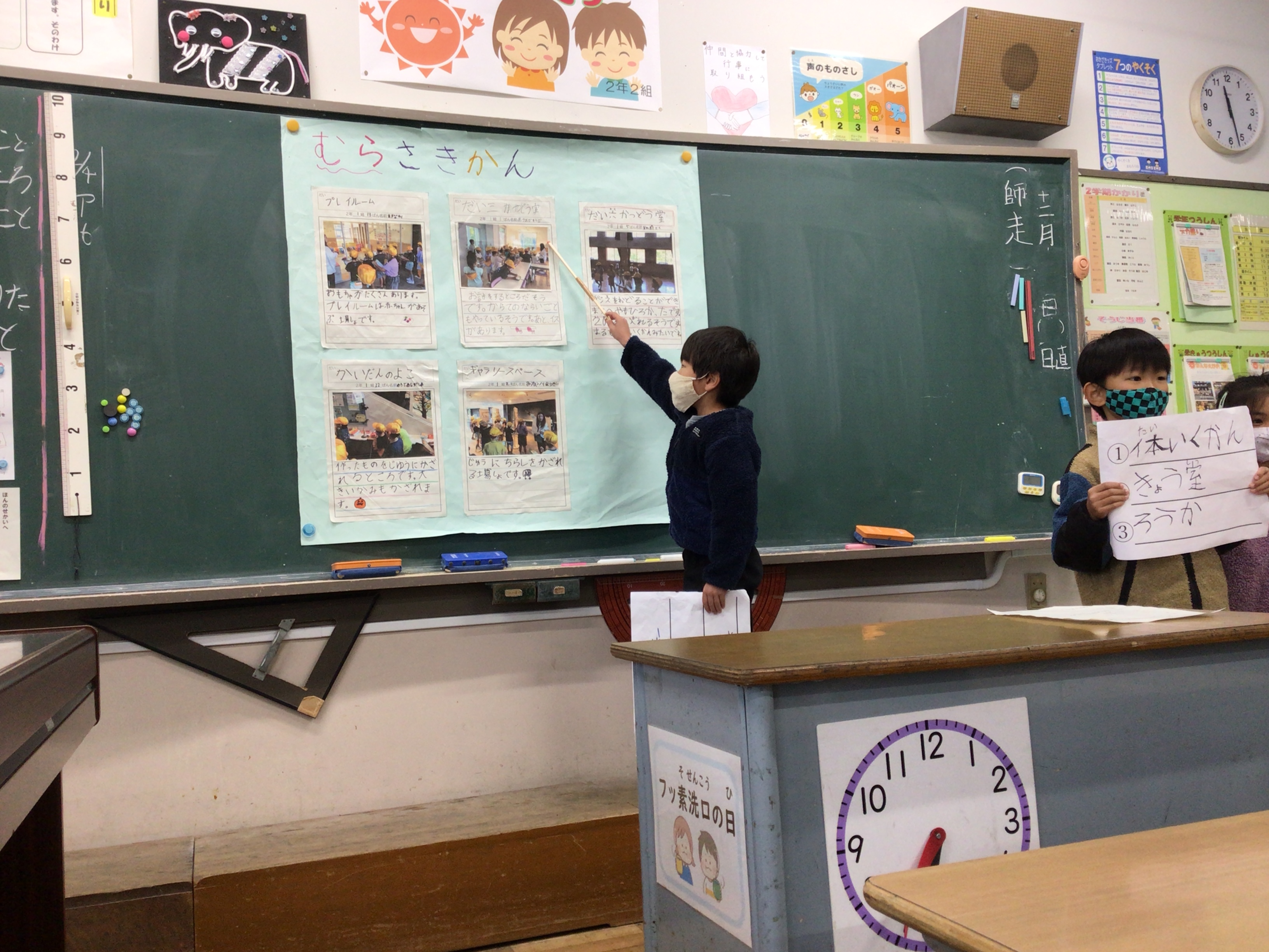 その模造紙を使って他のクラスの子に向けて発表します。チームで模造紙にまとめることも発表することも初体験の2年生。