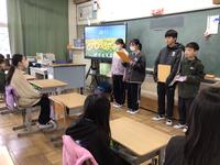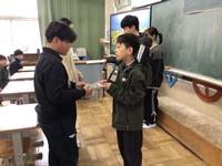 今日の朝、6年生が5年生に藤川宿についてまとめた冊子と藤川ガイドの映像を渡しに行きました。