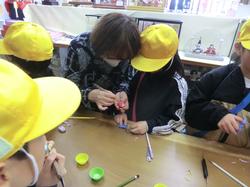 味岡人形さんでは、鞠のキーホルダーに布を貼りつける体験をさせていただきました。