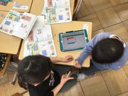 1年生の算数では「大きさくらべ」の学習をしました。授業の最後にタブレットを使って、「場所取りゲーム」を行いました。じゃんけんをして、勝ったら色を塗っていきます。塗った□を数えることで、広さを数値化して表す良さや、便利さに気付くことができました。