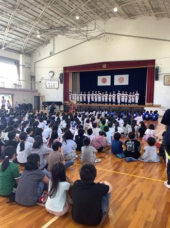 選手たちが大会に向けての熱い気持ちを述べ、全校児童は大きな声でエールを送りました。