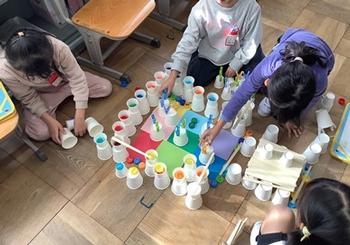 本日1年1組では、図画工作科の授業で、色・形・大きさの違う材料を用いて、お気に入りの並べ方を見つけました。どの子もたくさんの種類の材料に目を輝かせて、時間を忘れるほど夢中になって活動に取り組む姿が見られました。
