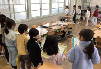 本日2年生では、明日に行われる町探検のための練習しました。「相手の方に聞こえるような声を出そう。」とお互いに呼び掛けたり、質問に答えてもらったら、「ありがとうございました!」と大きな声でお礼を言ったりする練習を、楽しそうに行っていました。町探検に関わる皆様、明日はどうぞよろしくお願いいたします。