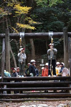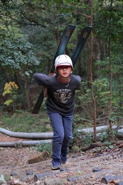 山の学習2日目のメインイベントは、落ち葉スキー&アスレチックです。