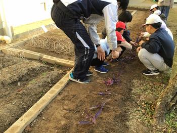 子供たちは、植えるところにある枯草をどかし、ムラサキゴテンを丁寧に植えました。