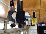 体育館にマットを敷き、少しの段差を作って歩いたり、実際に数段の階段を上り下りしたりするなど、「歩行体験者」「介助を試みる者」「観察する者」に分かれて交代しながら体験しました。