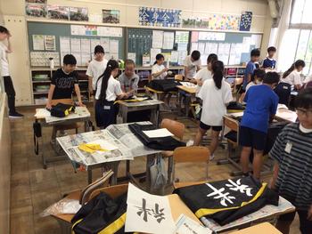 表現運動で使うはっぴに、文字を書いていました。衣装ができると、気持ちも盛り上がってきます。