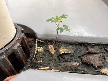2年3組のベランダの排水口の近くに植物が育っています。よく見ると、トマトのようです。1学期に