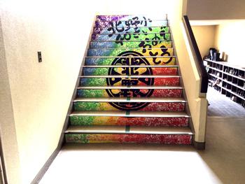 階段アートを制作し、昨日の夕方展示されました。虹の色の部分は、子供たちの手形で描かれています。