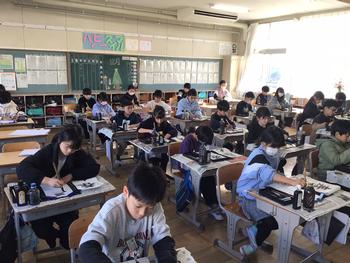 4年1組では、書写の時間に書き初めの練習をしていました。みんな無言で、集中して字を書いていました。