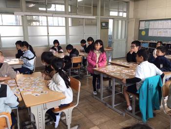 3年3組では、社会科で都道府県のかるたをしていました。絵札には、はじめの文字とその都道府県の特