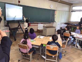 先生のタブレット端末の画面を表示させたりすることもできます。1年1組では、国語科の授業で電子黒板
