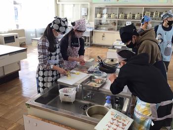 6年1組では、家庭科「こんだてを工夫して」で、ジャーマンポテト作りの調理実習をしていました。