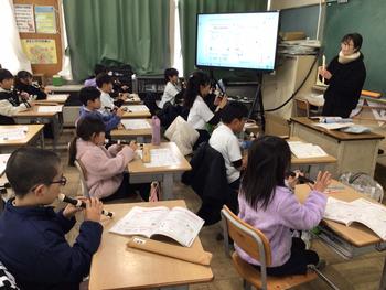 3年3組では、音楽科の時間にソプラノリコーダーの演奏に取り組んでいました。だんだんと、出せる