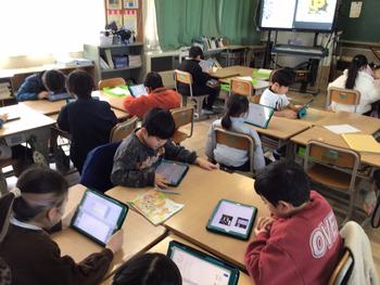 める活動をしていました。タブレット端末を使って調べたことを、新聞にまとめていました。新聞も、タブレ