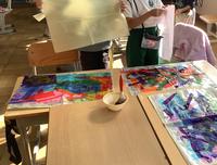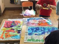2年生の図工で、「おはながみ かさねて すかして」という学習を行いました。子供たちは「お花紙」にあまり馴染みがないようで、薄いお花紙同士を重ねて透かしてみると、2つの色が混ざり合うことにびっくりしていました。色とりどりのお花紙をさまざまな形に切り、重ねて、洗濯糊で貼り付けていきます。糊が乾いた作品を窓辺に飾ったら、きっときれいな色の模様が見られますね。楽しみにしていてください。
