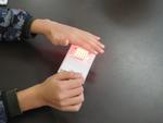 新しくなったiPadと人感センサーをつなぎ、規定のプログラムを使ってセンサーを遮ると赤い光がつくようにしました。