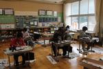 1時間目は体育館で始業式。子どもたちは校長先生の話をしっかりと聞いていました。