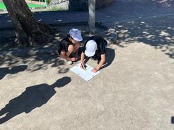 3年生が理科の学習で、校庭で影ができる方角を調べました。