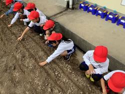 1年生がアサガオを育てていた鉢にチューリップの球根を植えました。
