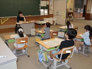1・2年生は、丸、三角、四角といった形を英語で表現する練習をしました。