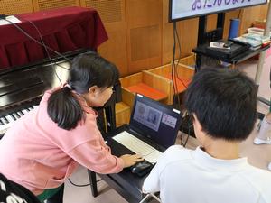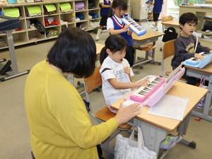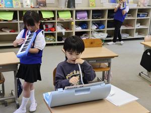 鍵盤ハーモニカやマーチングキーボードを使って、繰り返し、練習に取り組んでいました。