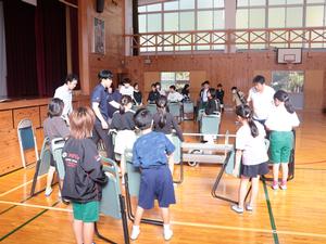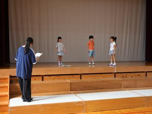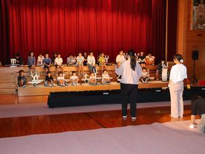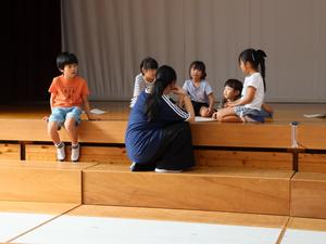 1・2年生が舞台の上で円を作って、みんなでじっくりと台本を読んでいました。
