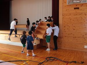 夏っ子が下校したあと、先生たちで仕上げを行い、いよいよ学芸会の舞台が完成しました。