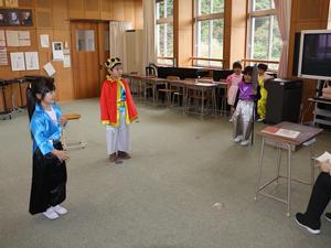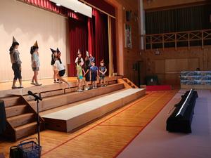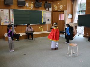 1,2年生は、音楽室で衣装を着けての練習です。がんばって覚えたセリフを、