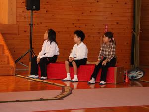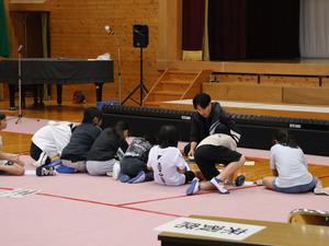 3.4年生は体育館の舞台を使って、身振りなどの動きを確認しながら練習していました。